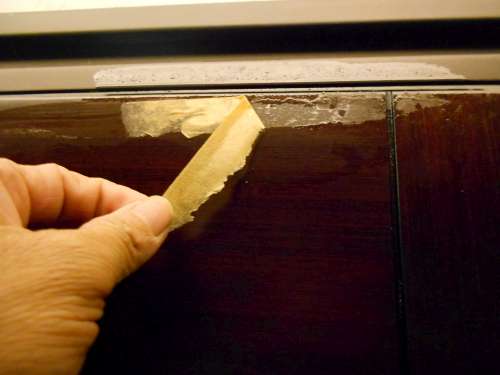 裝潢場裡常會有為了要做防護工作.木工師傅都很喜歡貼膠帶貼來貼去。除膠工作不可用甲苯或香蕉水.有揮發性的會使漆著點變成粗糙.最安全的除膠方法是選用有油脂的除膠劑或酒精是最安全的.又能讓表面光亮喔!